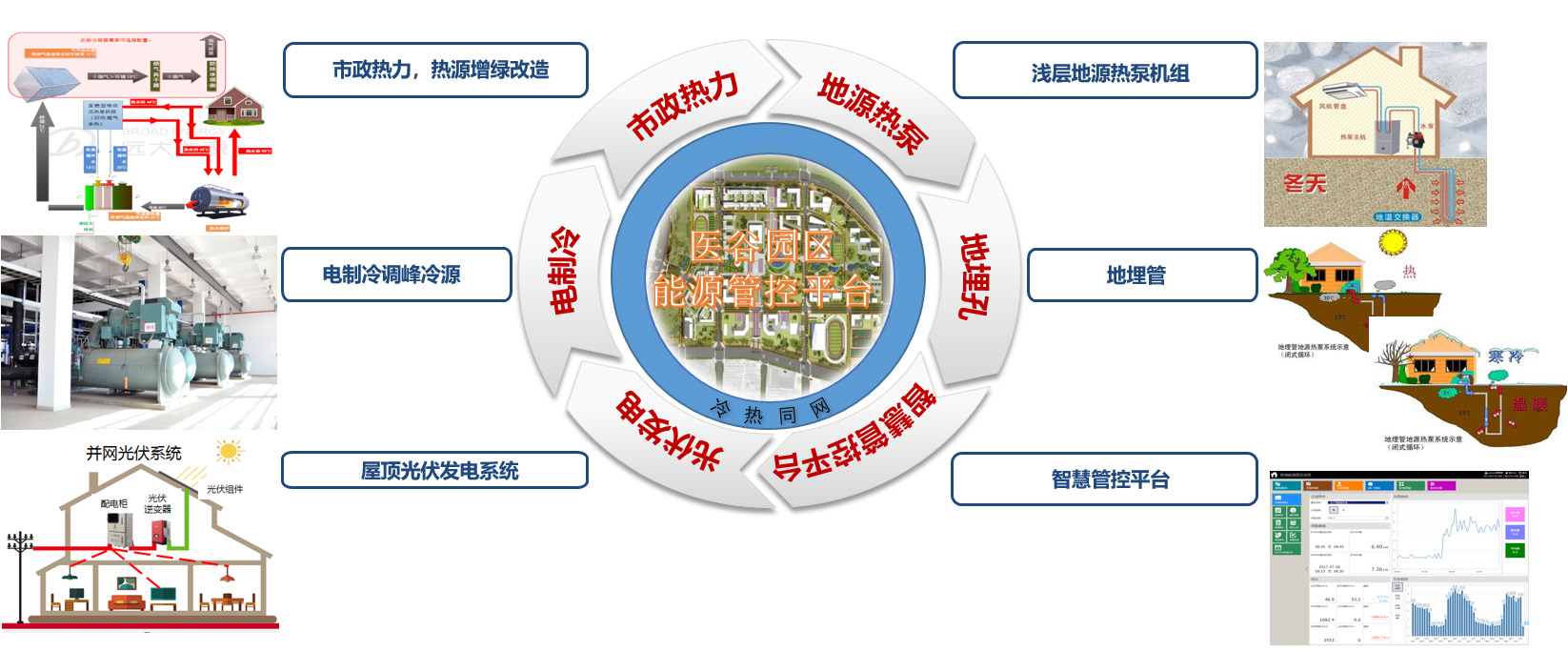 中关村医谷项目将由地源热泵、电制冷机组、市政热力等深度融合的大型多能耦合复合式能源系统组建而成。通过能源管控系统,优先利用地源热泵等可再生能源,以常规能源作为补充,实现多能互补、冷热同网、按需供能。年供热量为21.11万GJ,年供冷量达8236.8万kWh。项目还配备7MW光伏发电系统,预计年发电量达851万kWh,每年可节约标煤1046吨。形成“清洁能源利用率100%、可再生能源利用率67.5%”的多能互补供能体系,使中关村科学城国际医谷园区成为集“智慧园区、绿色园区、低碳园区”于一体的新型园区。